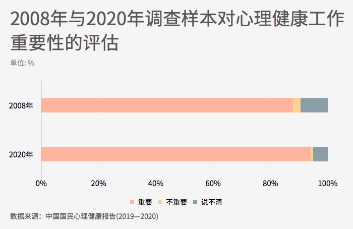 ??? 心理健康意識體現(xiàn)為認識到心理健康工作的重要性。對于心理健康工作重要性的評估,2020年調(diào)查中,有94.0%的調(diào)查對象認為心理健康工作是重要的。與2008年相比,2020年調(diào)查中,有更多的人認為心理健康工作重要,比12年前提高了6.1個百分點,說明人們的心理健康意識有所增強。