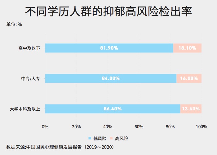 ??? 根據(jù)報告分析結(jié)果顯示,不同學歷組間差異顯著。學歷越高,心理健康水平越高,特別是大學本科及以上學歷人群的心理健康水平顯著高于更低學歷的人群。以抑郁為例,可以看到大學本科及以上學歷組的抑郁高風險檢出率較低。
