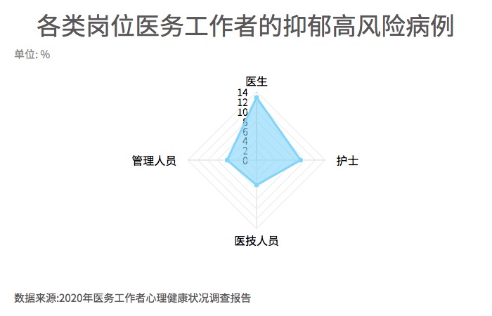 ????? 《中國國民心理健康發(fā)展報(bào)告(2020)》分報(bào)告《2020年醫(yī)務(wù)工作者心理健康狀況調(diào)查報(bào)告》對(duì)我國2466名醫(yī)務(wù)工作者進(jìn)行了調(diào)查。調(diào)查發(fā)現(xiàn),有27.7%的醫(yī)務(wù)工作者可能存在抑郁傾向,在不同崗位上的醫(yī)務(wù)工作者存在較高抑郁風(fēng)險(xiǎn)的比例為5.1%到12.8%不等。其中,醫(yī)生是風(fēng)險(xiǎn)比例最高的群體,其次是護(hù)士群體,其抑郁高風(fēng)險(xiǎn)比例為9.0%。
