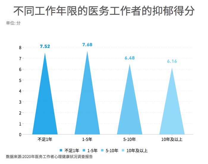 ????? 【工作1-5年的醫(yī)務(wù)工作者抑郁得分更高】