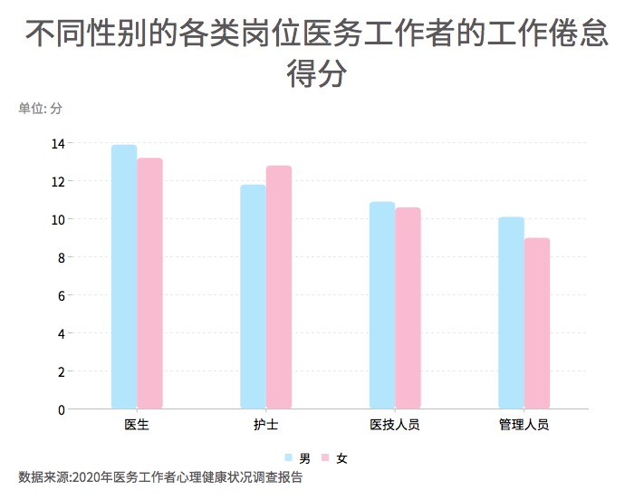 ?????? 根據(jù)調(diào)查,醫(yī)生的工作倦怠得分高于護(hù)士、醫(yī)技人員和管理人員。在醫(yī)生、醫(yī)技人員、管理人員三類崗位中,男性醫(yī)務(wù)工作者的得分均高于女性; 在護(hù)士群體中,女性的得分高于男性。