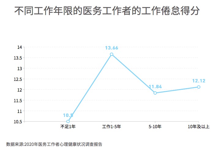 ?????? 在工作年限方面, 不同工作年限的醫(yī)務(wù)工作者在工作倦怠方面的得分存在顯著差異。 工作不足 1 年的醫(yī)務(wù)工作者的工作倦怠得分為 10. 50 分, 工作1-5年的醫(yī)務(wù)工作者的工作倦怠得分為 13. 66分, 工作5-10年的醫(yī)務(wù)工作者的工作倦怠得分為11.84分,工作 10年及以上的醫(yī)務(wù)工作者的工作倦怠得分為12.12 分。工作1-5年的醫(yī)務(wù)工作者的工作倦怠得分顯著高于其他工作年限的醫(yī)務(wù)工作者, 為所有工作年限的醫(yī)務(wù)工作者中得分最高的。