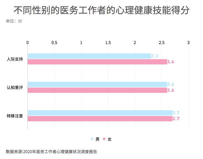 ????? 不同性別醫(yī)務(wù)工作者的心理健康技能得分在不同技能上差異不大, 男女兩性醫(yī)務(wù)工作者在認(rèn)知重評(píng)和轉(zhuǎn)移注意上的得分相同,只有在人際支持上存在差異。在人際支持上,男性醫(yī)務(wù)工作者的得分略低于女性醫(yī)務(wù)工作者。