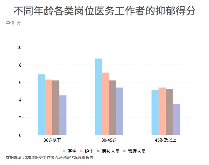 ????? 根據(jù)報(bào)告顯示,男性醫(yī)生的抑郁得分為8.4分,女性醫(yī)生的抑郁得分為6.9分; 男性護(hù)士的抑郁得分為7.5分,女性護(hù)士的抑郁得分為6.7分;男性醫(yī)技人員的抑郁得分為 6.4分,女性醫(yī)技人員的抑郁得分為5.8分, 男性管理人員的抑郁得分為6.1分,女性管理人員的抑郁得分為4.5分。其中,各個(gè)崗位的男性醫(yī)務(wù)工作者的抑郁得分都高于女性醫(yī)務(wù)工作者。
