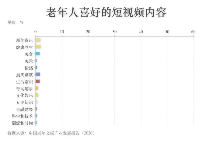 ????? 老年人群喜歡的短視頻內(nèi)容具有明顯的年代特征和生活氣息。健康養(yǎng)生、新聞資訊、搞笑幽默的內(nèi)容是很多老年群體首選觀看的短視頻內(nèi)容;其次,關(guān)于生活常識和美食的內(nèi)容也很受歡迎,歷經(jīng)風霜的老年人群依舊喜好人間煙火味兒。