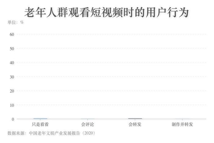 ???? ?總的來看,由于使用短視頻應用的熟練程度、觀看短視頻的習慣等一些因素的影響,老年人群觀看短視頻的互動較少,但較愛轉(zhuǎn)發(fā)。從所有年齡段的用戶互動來看,82.8%的用戶有過不同形式的短視頻互動。其中,63.8%的用戶會轉(zhuǎn)發(fā)分享,65.5%的用戶會點贊、評論、收藏,不參與互動的用戶僅占13.2%。參與轉(zhuǎn)發(fā)分享的短視頻用戶當中,20~39歲人群是主力軍,占比近60%,不參與互動的多為40歲以上的用戶。來自60加研究院的統(tǒng)計結(jié)果顯示,在參與互動的老年用戶中,會轉(zhuǎn)發(fā)的用戶占比達到53.8%,轉(zhuǎn)發(fā)是他們常有的互動行為。