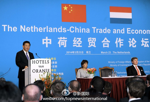 ????新華網(wǎng)北京3月24日電 據(jù)新華社“新國際”微博報道, 習近平主席出席中荷經(jīng)貿(mào)合作論壇開幕式,暢談豐碩合作成果。他還說:“荷蘭足球隊被稱為世界足球的‘無冕之王’。荷蘭是‘歐洲菜籃子’和‘郁金香王國’。”習近平這番話博得滿場掌聲和笑聲。