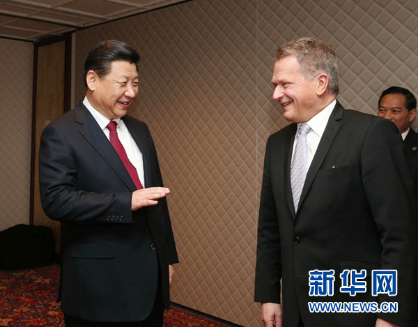 ????習近平表示,去年4月你訪華期間,我們一致同意將中芬關系定位提升為面向未來的新型合作伙伴關系,將投資、環(huán)保、創(chuàng)新、城鎮(zhèn)化作為合作重點領域。一年來,這些合作取得新進展,“美麗北京”環(huán)保項目和芬華創(chuàng)新中心是其中的亮點和典范。希望雙方圍繞兩國關系新定位,加緊商談有關政治文件,更好規(guī)劃各領域合作。雙方要共同辦好明年赫爾辛基藝術節(jié)中國主賓國活動。芬蘭是歐盟重要成員國。中方愿同芬方攜手推進中歐合作。