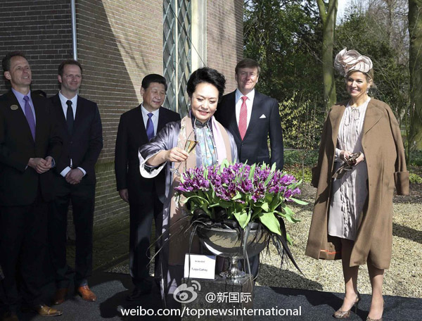 ????新華網(wǎng)北京3月24日電 據(jù)新華社“新國(guó)際”微博報(bào)道,荷蘭庫(kù)肯霍夫城堡,在習(xí)近平主席、威廉-亞歷山大國(guó)王和馬克西瑪王后見(jiàn)證下,習(xí)主席夫人彭麗媛應(yīng)邀為荷蘭新培育的郁金香命名。紫色的郁金香靜靜綻放。按傳統(tǒng),彭麗媛向它澆下香檳,輕聲命名“Cathay”,寓意“國(guó)泰”。馬克西瑪王后將“國(guó)泰”贈(zèng)予彭麗媛。?