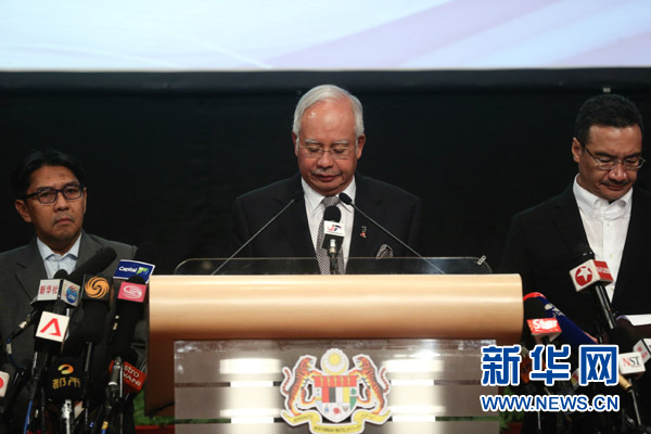 3月24日,在馬來(lái)西亞吉隆坡,馬來(lái)西亞總理納吉布(中)就馬航失聯(lián)航班舉行記者會(huì)。馬來(lái)西亞總理納吉布當(dāng)日在吉隆坡宣布,根據(jù)最新信息,馬航失聯(lián)航班MH370在南印度洋墜毀。 新華社記者 王申 攝