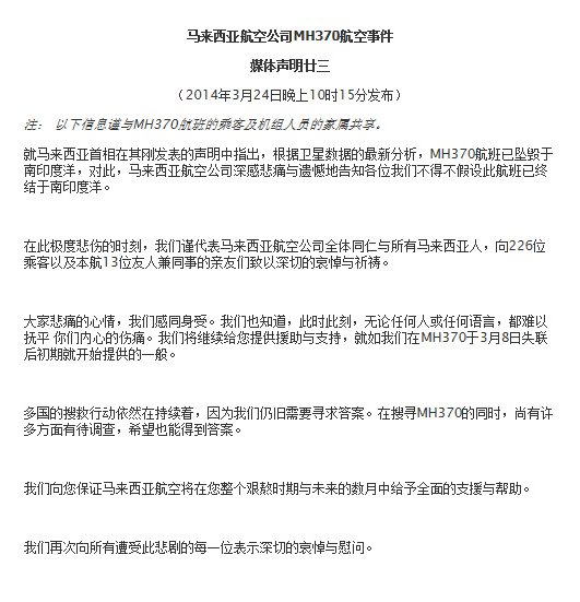 ????馬航官方網(wǎng)站上的《媒體聲明廿三》表示,“在此極度悲傷的時刻,我們謹(jǐn)代表馬來西亞航空公司全體同仁與所有馬來西亞人,向226位乘客以及本航13位友人兼同事的親友們致以深切的哀悼與祈禱。”