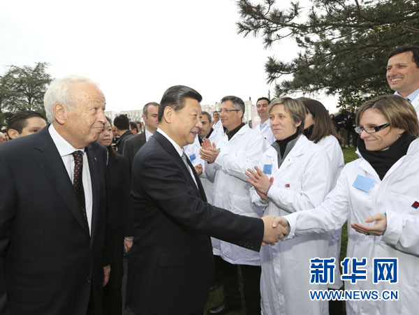 習(xí)近平和夫人彭麗媛抵達(dá)時(shí),梅里埃集團(tuán)總裁阿蘭·梅里埃率家族成員以及該中心員工列隊(duì)熱烈歡迎。法國政府外長法比尤斯、高教部長菲奧拉索陪同參觀。