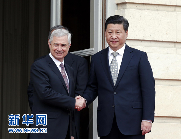 ????習近平表示,在中法建交50周年之際,我和奧朗德總統(tǒng)共同決定開創(chuàng)緊密持久的中法全面戰(zhàn)略伙伴關系新時代。中法關系站在新的歷史起點上,前景更加廣闊。雙方要以剛剛發(fā)表的中法聯(lián)合聲明為指引,筑牢政治、經(jīng)濟、人文三大支柱,推動中法關系取得新的更大發(fā)展。