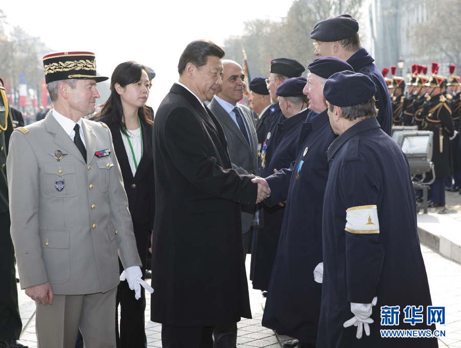 3月27日,國家主席習近平在巴黎向法國無名烈士墓獻花圈。這是習近平與老戰(zhàn)士交談。 新華社記者蘭紅光攝
