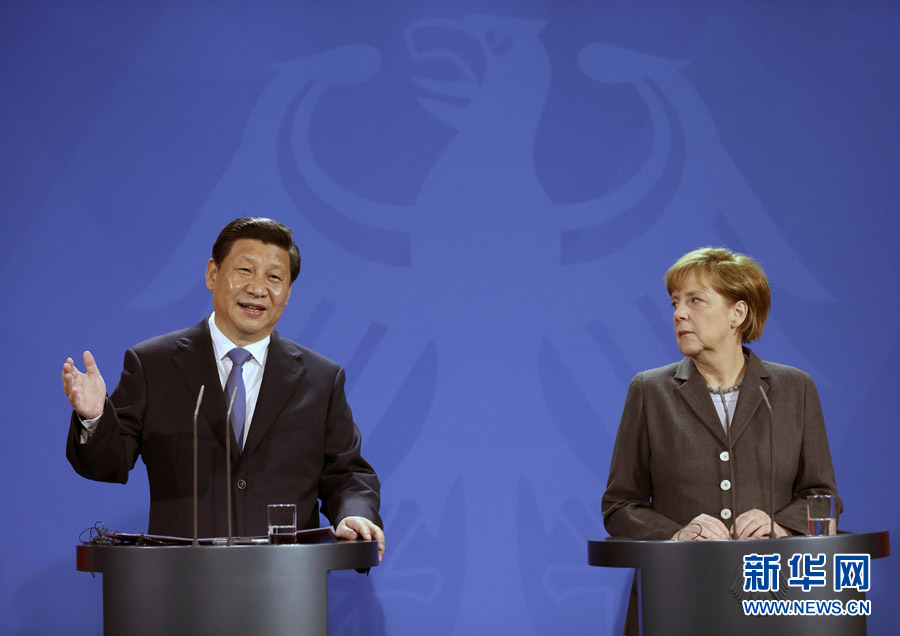 3月28日,國家主席習近平在柏林與德國總理默克爾共同會見記者。 新華社記者 蘭紅光 攝