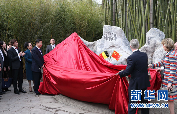 ????3月30日,國家主席習(xí)近平和比利時國王菲利普共同出席比利時天堂公園大熊貓園開園儀式。這是習(xí)近平和夫人彭麗媛同菲利普國王夫婦共同為大熊貓園揭幕。 新華社記者 龐興雷 攝