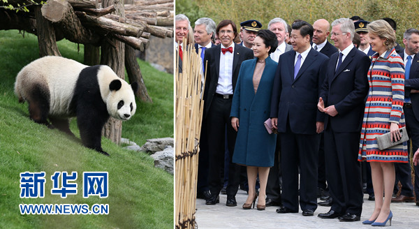????習(xí)近平和夫人彭麗媛抵達(dá)時,受到菲利普國王和瑪?shù)贍柕峦鹾?、比利時首相迪呂波熱情迎接。兩國領(lǐng)導(dǎo)人一同步入中國園。亭臺樓閣、雕梁畫棟、鳥語花香,這里宛如一幅恬靜祥和的中華寫意畫。兩國元首夫婦沿著回廊曲徑,穿過青翠竹林,前往大熊貓園。他們邊走邊談,回顧中比兩國友好交往。