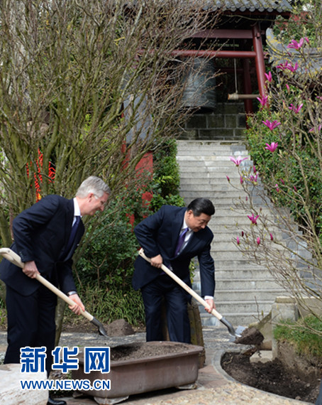 ????3月30日,國家主席習(xí)近平和比利時國王菲利普共同出席比利時天堂公園大熊貓園開園儀式。這是習(xí)近平與菲利普國王共同為一棵象征友誼的玉蘭樹培上新土。 新華社記者 馬占成 攝