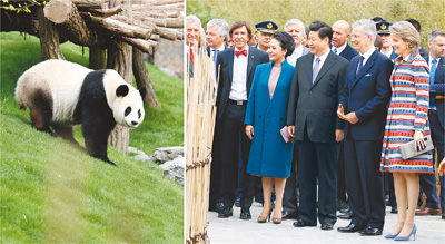 習(xí)近平和夫人彭麗媛抵達(dá)時(shí),受到菲利普國(guó)王和瑪?shù)贍柕峦鹾?、比利時(shí)首相迪呂波熱情迎接。兩國(guó)領(lǐng)導(dǎo)人一同步入中國(guó)園。亭臺(tái)樓閣、雕梁畫棟、鳥語(yǔ)花香,這里宛如一幅恬靜祥和的中華寫意畫。兩國(guó)元首夫婦沿著回廊曲徑,穿過(guò)青翠竹林,前往大熊貓園。他們邊走邊談,回顧中比兩國(guó)友好交往。
