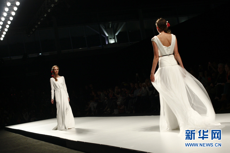 模特在T臺上展示西班牙品牌Victorio & Lucchino的婚紗。Victorio & Lucchino是來自西班牙塞維亞 (Sevilla)的兩位男服裝設(shè)計師的名字,Victorio和Lucchino同時也是西班牙本土知名時裝設(shè)計師組合之一。