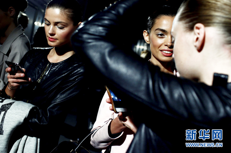 場外正在準(zhǔn)備登臺展示婚紗的模特。
