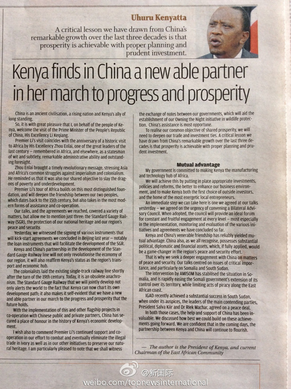 ????新華網(wǎng)北京5月11日電? 據(jù)新華社“新國際”微博報道,肯尼亞《旗幟報》11日發(fā)表肯雅塔總統(tǒng)署名文章《肯將中國視為發(fā)展繁榮進程中的強力伙伴》。文章稱,李克強此訪將進一步加深傳統(tǒng)友誼,推動雙方新時期合作。隨著多領(lǐng)域的良好合作,中國在肯經(jīng)濟社會發(fā)展中重要性與日俱增。肯方對肯中關(guān)系未來充滿信心。