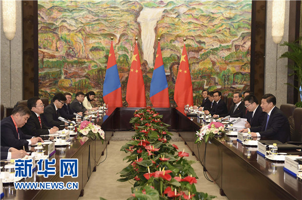 習(xí)近平強(qiáng)調(diào),我十分關(guān)心和高度重視中蒙關(guān)系。兩國(guó)領(lǐng)導(dǎo)人要保持密切交往和戰(zhàn)略溝通,實(shí)實(shí)在在推進(jìn)兩國(guó)合作。兩國(guó)立法機(jī)構(gòu)、政黨、軍隊(duì)也要加強(qiáng)交往。中蒙經(jīng)濟(jì)互補(bǔ)性強(qiáng)。中方開展對(duì)蒙合作堅(jiān)持互利雙贏原則,不搞我贏你輸、我多你少。中方愿本著礦產(chǎn)資源開發(fā)、基礎(chǔ)設(shè)施建設(shè)、金融合作“三位一體、統(tǒng)籌推進(jìn)”原則,以互聯(lián)互通建設(shè)為優(yōu)先方向,以建設(shè)絲綢之路經(jīng)濟(jì)帶為契機(jī),拓展兩國(guó)合作,鼓勵(lì)有實(shí)力的中國(guó)企業(yè)赴蒙投資興業(yè)。中方支持蒙方積極參與國(guó)際和地區(qū)事務(wù),愿同蒙方加強(qiáng)在聯(lián)合國(guó)、上海合作組織等框架內(nèi)合作。