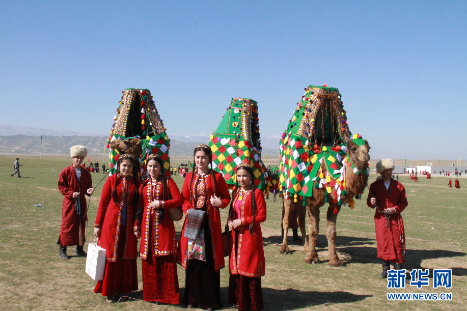 ????記者還看到過(guò)20來(lái)頭駱駝組成的駝群,其中頭駱身上綁著個(gè)布袋。駱駝低頭吃草,頭駝警覺(jué)地給它們站崗放哨。不一會(huì)兒,一些駱駝走到頭駝身前,向它施貼臉禮,頭駝一一回禮。當(dāng)記者試圖靠近時(shí),頭駝發(fā)出低沉的怪聲,群駝迅速抬起頭來(lái),慢慢地朝遠(yuǎn)方走去。在過(guò)節(jié)時(shí),牧民小伙穿上紅色條狀長(zhǎng)袍,頭戴白色羊羔皮帽,手牽的駱駝身上裹著人工織的毛毯,背上架著花轎,花轎中坐著美麗少女,少女頭戴小帽,梳著兩根長(zhǎng)辮,身穿蓋過(guò)腳面的長(zhǎng)裙。這是在給節(jié)日助興。同時(shí),這也是土庫(kù)曼斯坦民族婚禮中迎娶新娘的一個(gè)縮影。在現(xiàn)實(shí)生活中,城市人很少見(jiàn)到駱駝。于是在各種活動(dòng)中,跟打扮得如此漂亮的駱駝合影也是一件趣事。