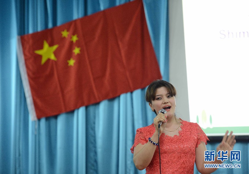 6月9日,學(xué)生代表在烏茲別克斯坦首都塔什干的烏世界語(yǔ)言大學(xué)禮堂表演節(jié)目。