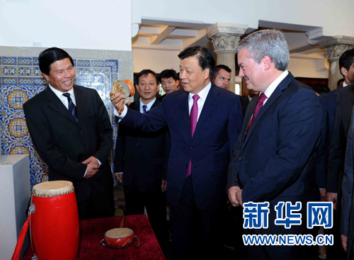 ??? 6月17日至19日,應(yīng)葡萄牙政府邀請,中共中央政治局常委、中央書記處書記劉云山對葡萄牙進(jìn)行正式訪問。這是6月19日,劉云山在波爾圖出席慶祝中國葡萄牙建交35周年中國文化周開幕式活動,參觀中葡文化展。 新華社記者 饒愛民 攝