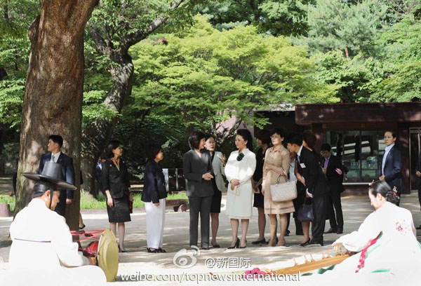 ???? 新華網(wǎng)北京7月3日電? 據(jù)新華社“新國(guó)際”微博報(bào)道,習(xí)近平主席夫人彭麗媛3日下午在韓國(guó)官員陪同下參觀被列為世界文化遺產(chǎn)的昌德宮,了解宮殿建筑歷史、音樂(lè)傳承等情況,并欣賞韓國(guó)傳統(tǒng)樂(lè)器伽倻琴散調(diào)表演,對(duì)藝術(shù)家的精彩演出表示高度贊賞。彭麗媛說(shuō),中韓友誼源遠(yuǎn)流長(zhǎng),歡迎韓國(guó)朋友多到中國(guó)參觀訪問(wèn)。