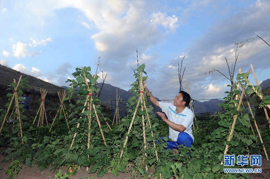 ????7月5日,烏茲別克斯坦安革連至琶布鐵路隧道項目安革連隧道進口西口分部生活區(qū),杜潮停在菜地查看豆角長勢。(沙達提 攝)
