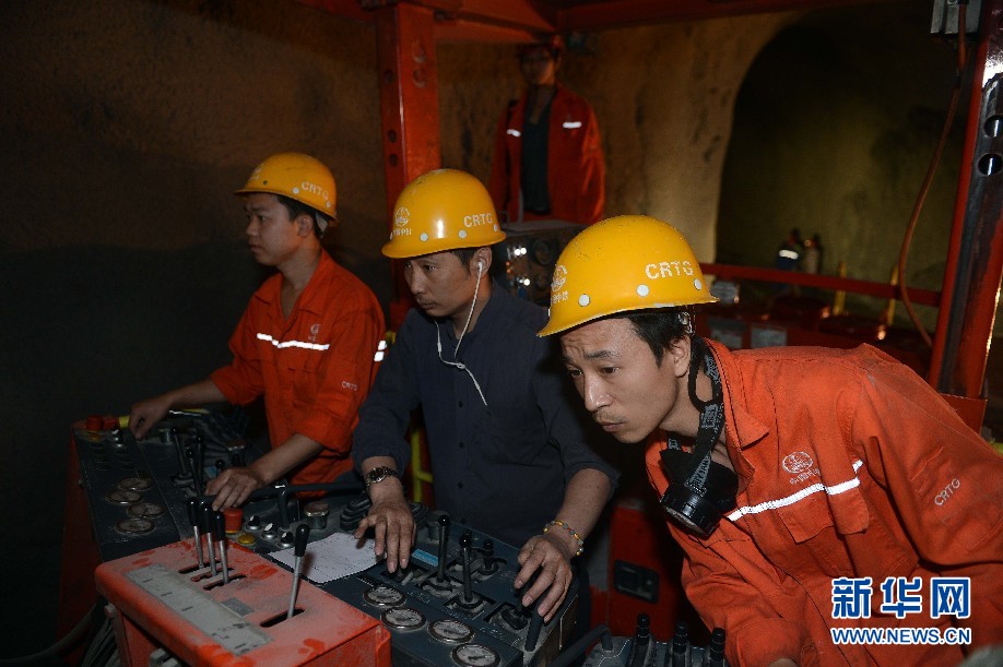 7月5日,工人們在烏茲別克斯坦安革連至琶布鐵路隧道緊張工作。(沙達提 攝)