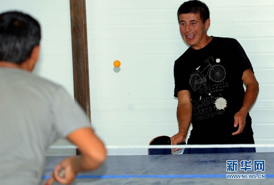????7月5日,烏茲別克斯坦安革連至琶布鐵路隧道項目安革連隧道進口西口分部,烏茲別克員工在打乒乓球。(沙達提 攝)