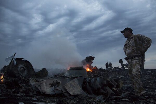 ??? 當(dāng)?shù)貢r間2014年7月17日,烏克蘭頓涅茨克地區(qū),馬來西亞航空公司波音777飛機(jī)墜毀現(xiàn)場。 圖片來源:美聯(lián)社