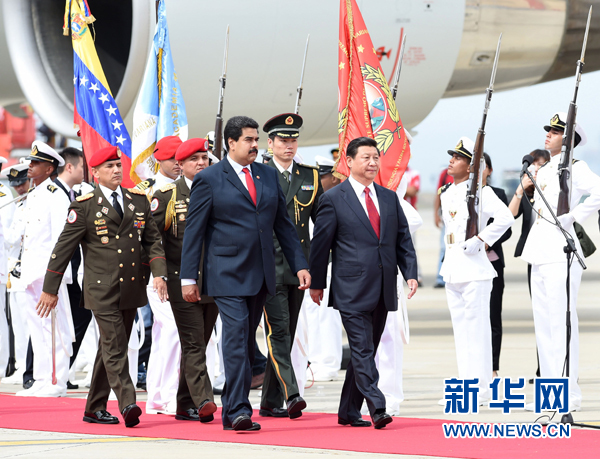 ??? 當(dāng)?shù)貢r(shí)間7月20日,國(guó)家主席習(xí)近平抵達(dá)加拉加斯,開(kāi)始對(duì)委內(nèi)瑞拉進(jìn)行國(guó)事訪問(wèn)。委內(nèi)瑞拉總統(tǒng)馬杜羅在機(jī)場(chǎng)為習(xí)近平舉行隆重歡迎儀式。新華社記者劉建生攝