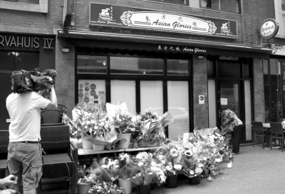 民眾在鹿特丹一家中餐館前悼念馬航空難中遇難的華人夫婦。新華社發(fā)