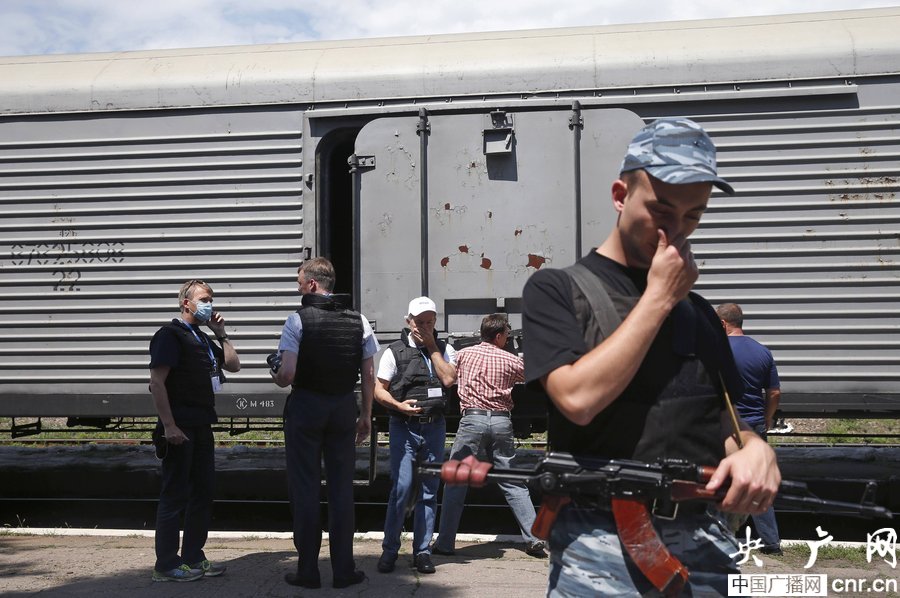 當(dāng)?shù)貢r間2014年7月20日,烏克蘭頓涅茨克Torez,馬航墜機(jī)遇難乘客遺體被裝上列車?yán)洳剀噹麑⒈贿\走。載有部分遺體的火車從距空難現(xiàn)場不遠(yuǎn)的烏克蘭托列茲市出發(fā),前往頓涅茨克市。火車離站前,身處空難現(xiàn)場的歐洲安全與合作組織(歐安組織)代表檢查了運載遺體的5節(jié)冷藏車廂。