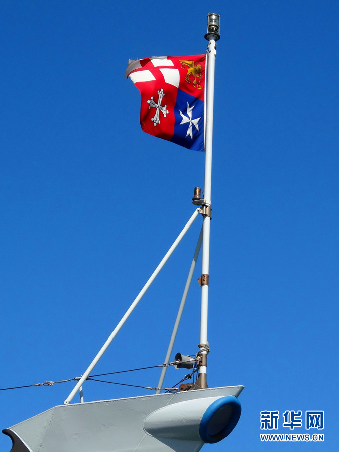????意大利海軍軍旗。帶領(lǐng)記者參觀的工作人員說,軍旗上的四塊標(biāo)志代表了意大利的四個(gè)不同城市。新華網(wǎng)記者 周喆 攝