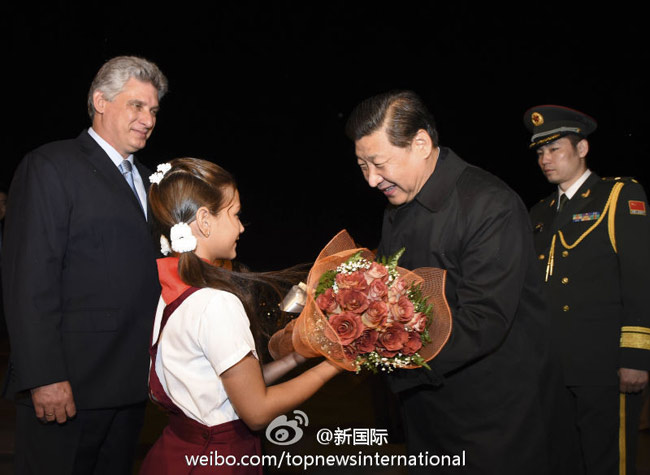 ???? 新華網(wǎng)北京7月22日電 據(jù)新華社“新國際”微博報道,結(jié)束對委內(nèi)瑞拉的國事訪問后,習(xí)近平主席乘坐的專機(jī)經(jīng)過3個多小時飛行,于當(dāng)?shù)貢r間21日晚抵達(dá)哈瓦那,開始對“加勒比明珠”古巴的國事訪問。2011年,時任國家副主席的習(xí)近平曾經(jīng)訪問過古巴。(李學(xué)仁攝)