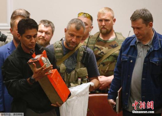 當(dāng)?shù)貢r(shí)間2014年7月22日,頓涅茨克,“頓涅茨克人民共和國(guó)”官員向馬來西亞調(diào)查人員移交馬航MH17航班客機(jī)黑匣子。