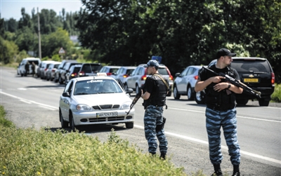 7月28日,來自澳大利亞和荷蘭的調(diào)查人員前往墜機(jī)現(xiàn)場途中,烏克蘭民間組織在其車隊(duì)后面封鎖道路。
