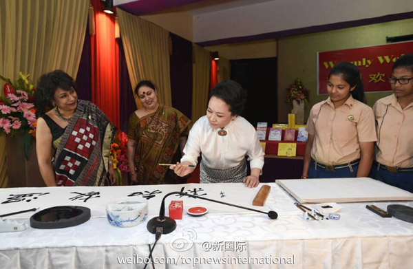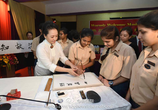 ????新華網(wǎng)北京9月18日電 據(jù)新華社“新國際”微博報道,習(xí)近平主席夫人彭麗媛18日上午在新德里參觀泰戈爾國際學(xué)校時,用毛筆書寫成語“溫故知新”,并簽名蓋上印章。她對師生們逐字講解后說,我們要經(jīng)常溫習(xí)學(xué)過的知識,不斷學(xué)習(xí)掌握新知識,開拓創(chuàng)新,與時俱進(jìn)。希望同學(xué)們認(rèn)真學(xué)習(xí),更好報效祖國,祝你們成功。