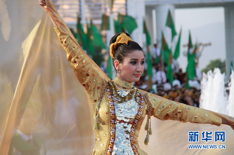 身著節(jié)日盛裝的土庫曼斯坦美女在跳舞? 記者 盧敬利攝