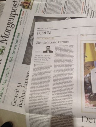 柏林市中心亞歷山大地鐵站的書(shū)報(bào)店里,洛塔爾·沙爾夫拿起一份報(bào)紙遞給我們:“今天的《世界報(bào)》上有你們總理發(fā)表的文章?!?/p>