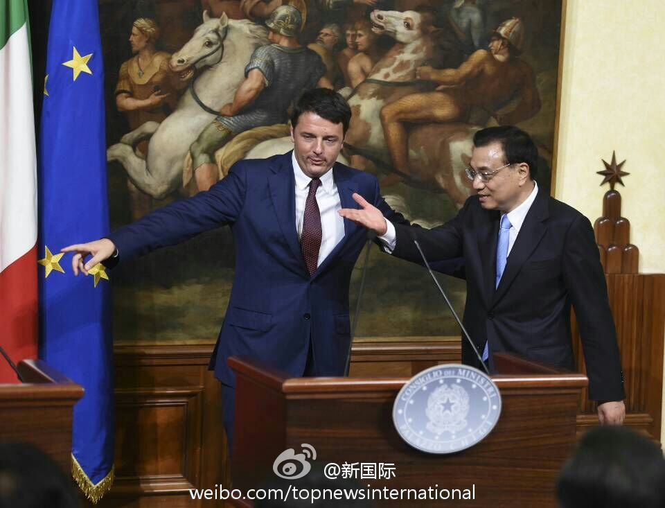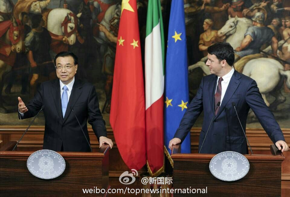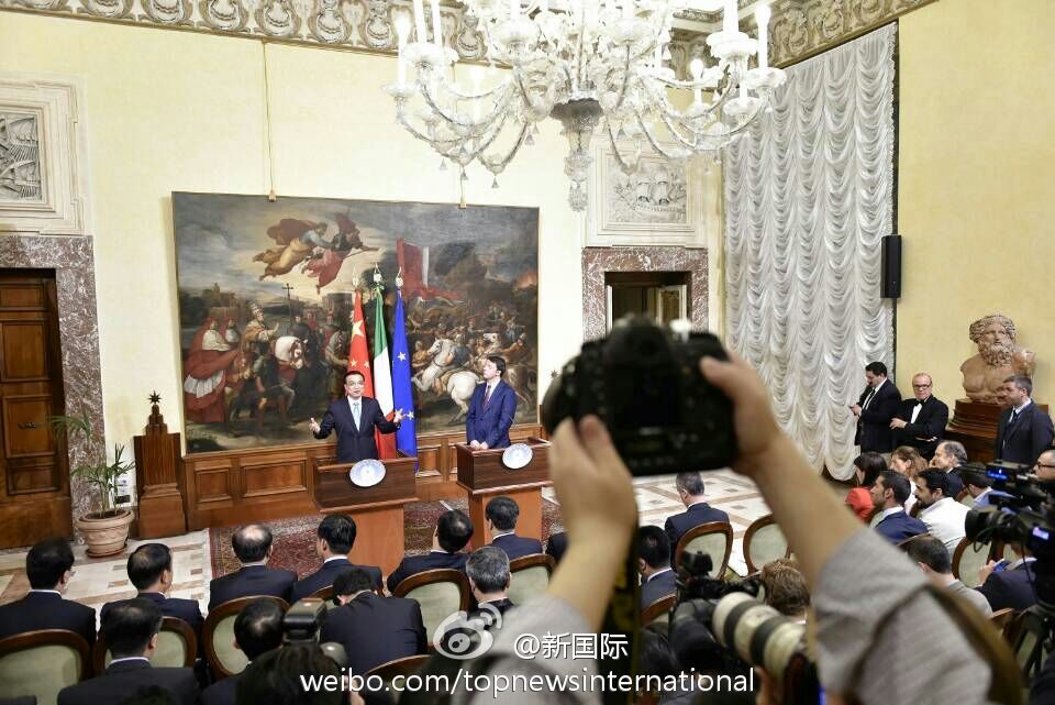 ??? 新華網(wǎng)北京10月15日電 據(jù)新華社“新國際”微博報道,國務(wù)院總理李克強14日與意大利總理倫齊在意總理府共同會見記者。李克強說,很高興來到不是一天建成的羅馬,中方不追求對意貿(mào)易順差,對擴(kuò)大中意貿(mào)易合作規(guī)模充滿信心,愿與意方繼續(xù)深挖務(wù)實合作。即將簽署的協(xié)議規(guī)模高達(dá)80億歐元,這說明貿(mào)易投資規(guī)模還會擴(kuò)大。?