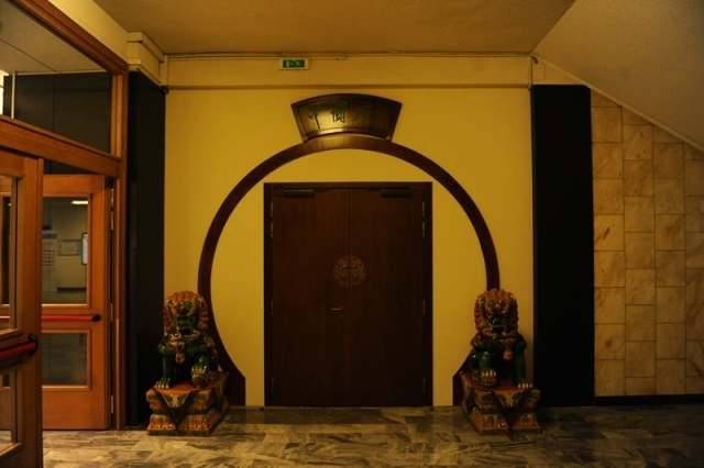 ????中國廳的大門采用了中式古典園林常見的月亮形拱門,旁邊蹲著兩尊唐三彩的小獅子。屋里的宮燈、瓷瓶、雕塑、堆繡的《清明上河圖》,無不透著濃濃的中國韻味。正對廳門的墻壁上還掛有一幅中國地圖。