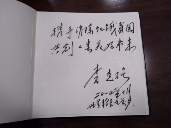 ????石板前面擺放著一張簽字桌,桌上放著一本叫做golden book(金書)的簽到簿,是專供到訪的國家領導人用的。克強總理在上面寫下了這樣一句話“攜手消除饑餓貧困 共創(chuàng)人類美好未來”。
