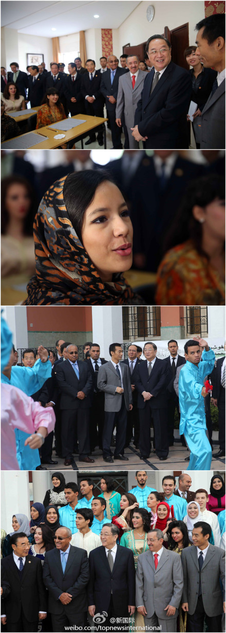 ??? 新華網(wǎng)北京11月6日電 據(jù)新華社“新國際”微博報(bào)道,全國政協(xié)主席俞正聲5日參觀摩洛哥穆罕默德五世大學(xué)孔子學(xué)院,身著摩中兩國民族服裝的當(dāng)?shù)貙W(xué)生誦唐詩、打太極、跳《小蘋果》歡迎。俞正聲走進(jìn)課堂對學(xué)生說:“你們是中摩友好的未來。希望大家用心學(xué)好中文,促進(jìn)合作交流?!?(記者李拯宇 攝影劉衛(wèi)兵)