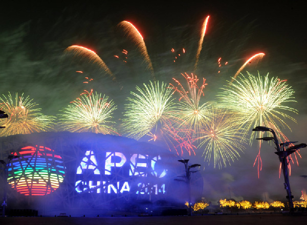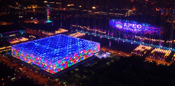 17時40分許,水立方和鳥巢的彩燈已經(jīng)在夜色中閃亮。當晚,國家主席習近平和夫人彭麗媛在北京國家游泳中心(水立方)舉行宴會,歡迎出席APEC會議的各成員經(jīng)濟體領導人或代表及配偶。